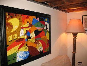 Allora cosè successo... Da giorni si scherzava con chi ha parecchi quadri miei.... Mi prendevano in giro... Giallo Pipì... Quadri di merd... Dove vuoi che appenda il prossimo??? E a questultima domanda risposi... IN BAGNO. Si... A casa mia in bagno ho 5 quadri.. Secondo me è un posto sottovalutato... A volte ti siedi li e leggi... Ma perchè non unire lutile al dilettevole e esporre in bagno in fiera... Ci si fa notare, si ride e si allevia la triste pisciatina dei galleristi.... Beh... Accontentati... Siamo entrati in 4 con 6 quadri a testa.. ed ecco che ne è venuto fuori!!!