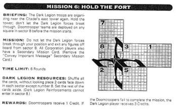 ISTRUZIONI: Le truppe Dark Legione si stanno riorganizzando vicino alla torre est della Cittadella. Occupare la torre, non permettete che le forze Dark Legion passino attraverso. Le squadre Doomtrooper vanno dispiegate in qualsiasi casella del secror 8 prima che la missione abbia inizio. MISSIONE: Non permettere alle forze Dark Legion di rompere la vostra posizione e uscire dal settore 8. Tutti i giocatori anche Corporation hanno una Scondary Mission Card. (Rimuovere la Secondary Mission Card "Convey lmponant Message"). TEMPO LIMITE: 6 Turni. RISORSE DARK LIGION: Mescolare le carte, senza guardare mettere 2 carte a faccia in giù in ogni settore, tranne nel numero 8. Mettere da parte il resto delle carte. (I Rinforzi Dark Legion non possono entrare dal settore 8.) PREMI: I Doomtroopers ricevono 1 credito. Se il Doomtroopers non riescono a completare la missione, il giocatore Dark Legion riceve 3 crediti.