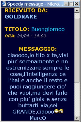 Sei l’unico ke mi ha fatto volare solo con uno sguardo, una parola! Ke mi ha fatto assaggiare le emozioni più sincere! L’unico ke è riuscito a farmi credere in quello in cui nn credevo più!