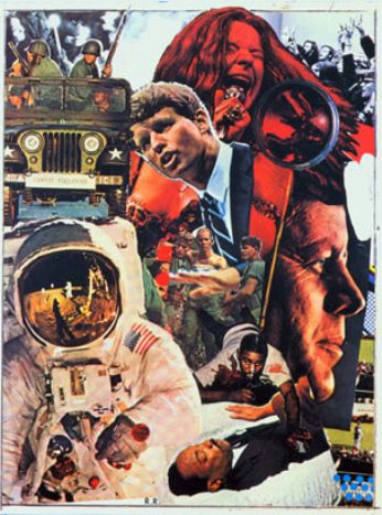 One of Rauschenbergs first and most famous combines was entitled "Monogram" (1959) and consisted of an unlikely set of materials: a stuffed angora goat, a tire, a police barrier, the heel of a shoe, a tennis ball, and paint. This pioneering altered the course of modern art. The idea of combining and of noticing combinations of objects and images has remained at the core of Rauschenbergs work. As Pop Art emerged in the 60s, Rauschenberg turned away from three-dimensional combines and began to work in two dimensions, using magazine photographs of current events to create silk-screen prints. Rauschenberg transferred prints of familiar images, such as JFK or baseball games, to canvases and overlapped them with painted brushstrokes. They looked like abstractions from a distance, but up close the images related to each other, as if in conversation. These collages were a way of bringing together the inventiveness of his combines with his love for painting. Using this new method he found he could make a commentary on contemporary society using the very images that helped to create that society.