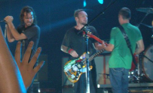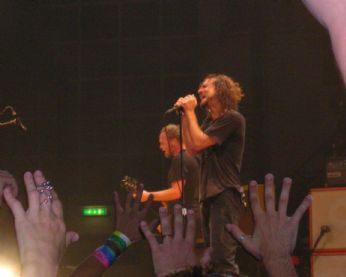 Poi parte massiccio con Do the evolution e tutto il resto....carica, chitarre, lui appeso al microfono con i ricci che gli coprono la faccia, Animal...gente che mi schiaccia, io che avanzo, che riesco a guardarlo davvero da vicino...e stone gossard di fronte a me con jeff che ogni tanto viene a giocargli vicino. Poi parte Given to fly....ho un sobbalzo, saranno 4 anni che non ascolto questa canzone....ma la so a memoria, si canta a squarciagola, con le braccia alzate a V...e mi ricordo tutto il suo significato " hey look at me now...!!"
