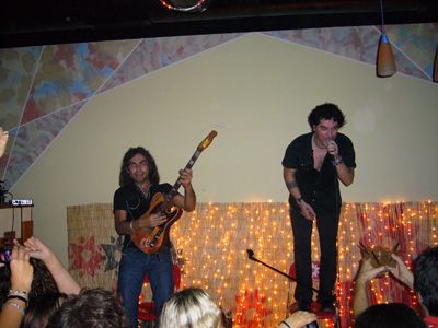Un po’ in ritardo dato che ormai sono quasi pronta per il prossimo ma ecco il racconto di una notte di mezza estate... ah no, del mio week-end!! Sabato sono andata ad un compleanno nel paese di molto molto lontano e poi c’era il concerto di loro: Quello a sinistra è il fratello del Luciano Ligabue... Marco! Che ha cambiato tre chitarre in un concertino... me despiase pa eo ciò! Cmq non sapevo della loro esistenza fino a una settimana e mezza fa! Al concerto ci divertivamo ad ascoltare la prima volta il ritornello, la seconda lo cantavamo a metà e dalla terza savevimo tutta a canson praticamente!! Ci siamo divertiti e cmq hanno fatto uno bellllllo spettacolo!!! W! E domenica... HO VISTO GLI ALIENI: si sono nutriti di pasta al ragù cucinata con acqua mai bollita: hanno continuato a mangiare con una meravigliosa torta salata (foto non pervenuta) e concluso con ottimi dolci fatti in casetta: dalla mangiata hanno avuto energie per far spazio ad un loro simile rimasto nel pianeta del letto e delle copertine... e hanno dato il massimo per la prima Air Band Aliena: